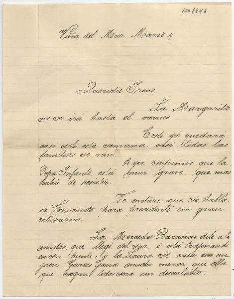 [Carta] [1913?] Marzo, Viña del Mar [para Doña Irene Lazcano Echaurren] [manuscrito] Maria Teresa.