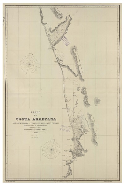 Plano de la Costa Araucana que comprende desde la Punta Cauten hasta la Punta Chanchan [material cartográfico] : levantado de orden del Supremo Gobierno por el Teniente 1° de Marina Dn. Francisco Vidal Gormaz en 1866 i 1867.