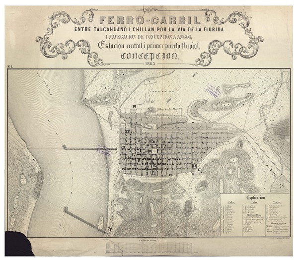 Ferro-carril entre Talcahuano i Chillán, por la vía de La Florida i navegación de Concepción a Angol Estación central, i primer puerto fluvial. Concepción [material cartográfico] : levantado por Pascual Binimelis.