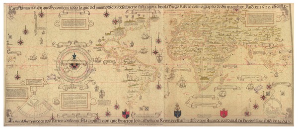Carta univerfal en que se contiene todo lo que del mundo se ha descubierto falta agora [material cartográfico] hizola Diego Ribero cosmographo de su magestad, año de 1529, e[n] Sevilla.
