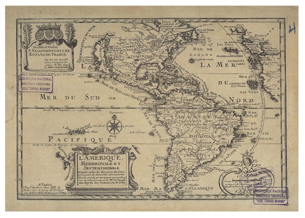 L'Amerique, meridionale et septentrionale Drefsée selon les dernieres Relations et suivant les Nouvelles Dwecouvertes dontles points principaux sont placez sur les Observations de Mrs. del Academie Royale des Sciences [material cartográfico] : par N. de Fer.