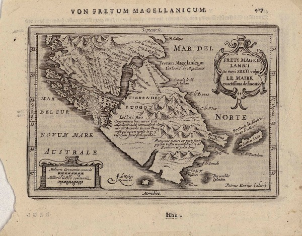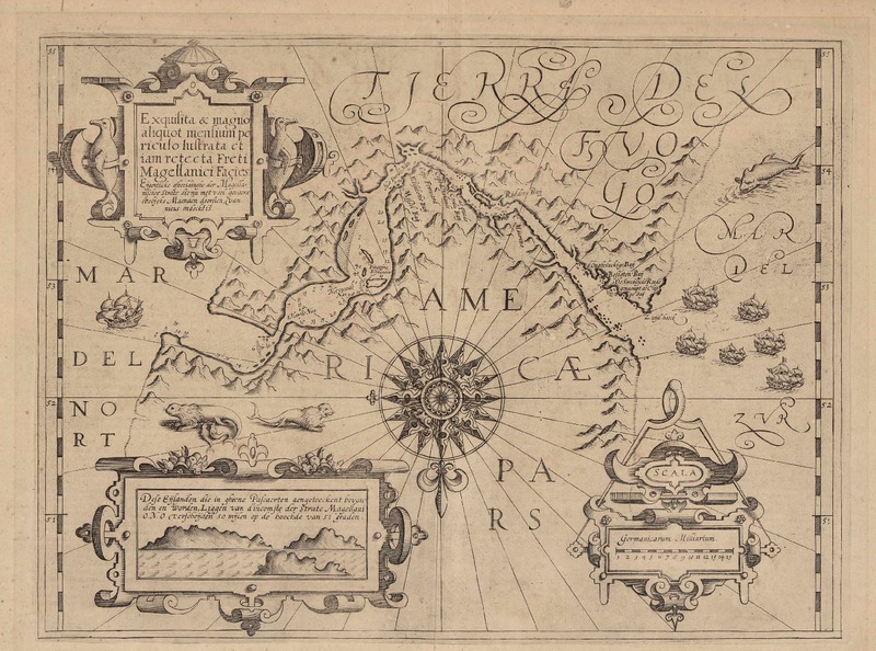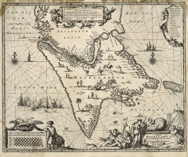 Tabvla Magellanica : qua Tierrae del Fuego, cum celeberrimis fretis a F. Magellano et I. Le Maire detectis noviffima et accuratiffima defcriptio exhibetur ; Nobili, Et Magnifico Viro, D. Constantino Hvgenio Eqviti, Domino in Zvylichem, Et Illvstrissimo Principi Avraico A Secretis [material cartográfico] Hanc exactiffimam Terrae Magellanicae defcriptionem dedicat Guiljelmus Blaeu.