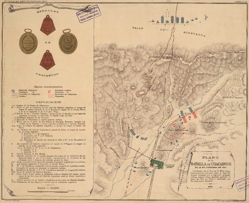 Plano de la batalla de Chacabuco el 12 de febrero de 1817 [material cartográfico] : coordinado por el General B. Mitre según reconomicimiento personal, sobre la base del croquis levantado por el Ingeniero geógrafo chileno Alberto Llona, teniendo presente el plano de Chile por Pissis y combinado con los testimonios históricos; dibujado por Carlos Beyer.