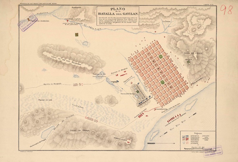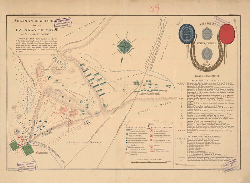 Plano topocrafico de la batalla de Maypu el 5 de abril de 1818 [material cartográfico] : levantado por Alberto d´Albe Ingeniero del Ejército de los Andes, confrontado sobre el terreno y coordinado con otro plano levantado por el Coronel José de Arenales según datos de San Martín y un croquis de los Ingenieros de los Andes José Antonio Alvarez Condarco y Antonio Arcos, revisado por Las heras, coordinados por B. Mitre; dibujado por Carlos Beyer.