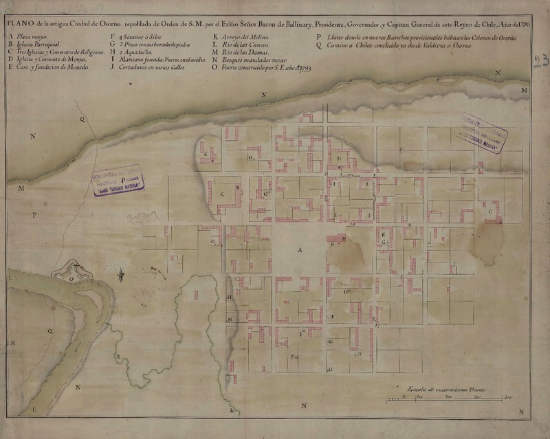 Plano de la antigua ciudad de Osorno repoblada de orden de S.M. por el Exmo Señor Baron de Ballinary, presidente, gobernador y capitán general de este reyno de Chile. [material cartográfico] :