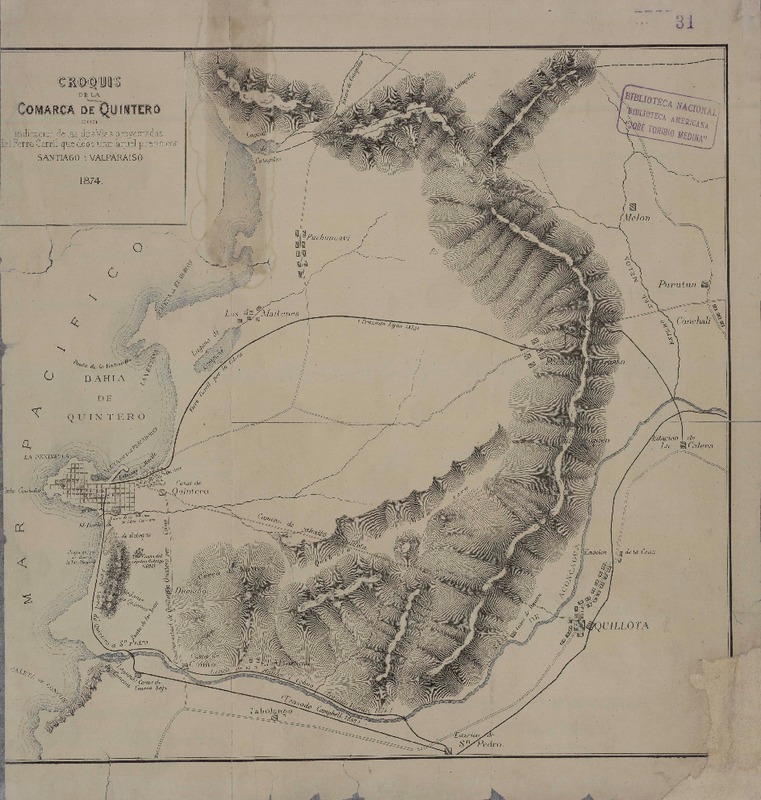 Croquis de la comarca de Quintero con indicaciones de las dos Vías proyectadas del Ferrocarril que debe unir aquel puerto con Santiago i Valparaíso. [material cartográfico]