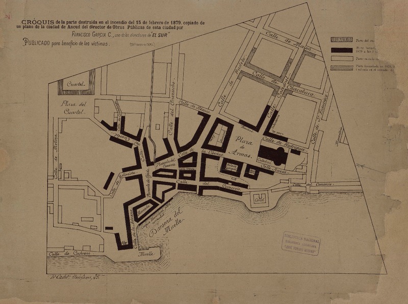 Croquis de la parte destruida en el incendio del 15 de febrero de 1879 : copiado de un plano de la ciudad de Ancud del director de Obras Públicas de esta ciudad [material cartográfico] por Francisco García C.