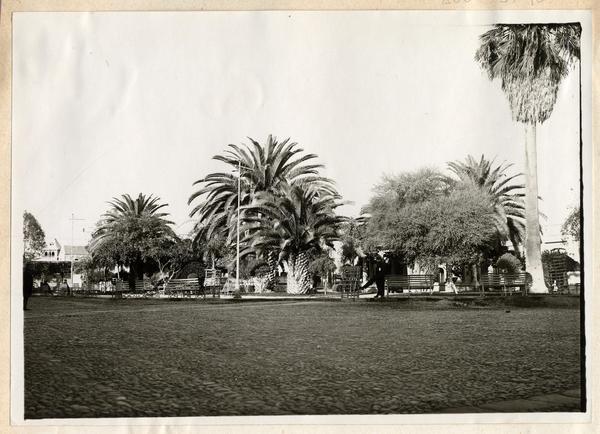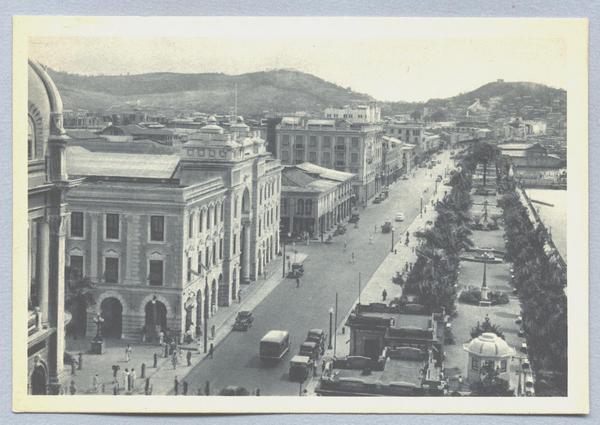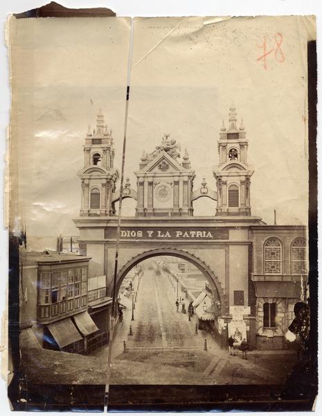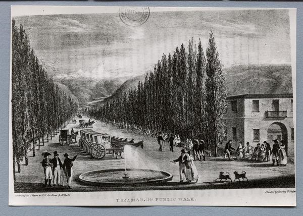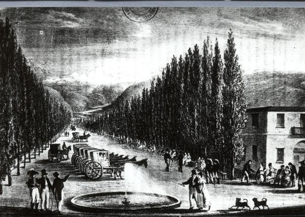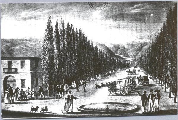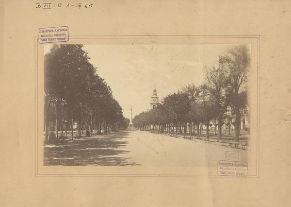[Alameda de las Delicias: al fondo, se observa la torre de la Iglesia de San Francisco y el obelisco que recuerda la Primera Junta de Gobierno 1810 (hoy desaparecido)] [fotografía] Fotografía del Teatro Walsh y Cunningham.