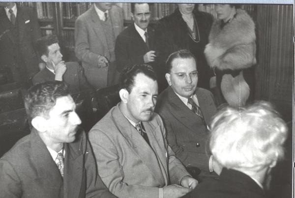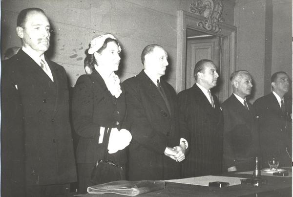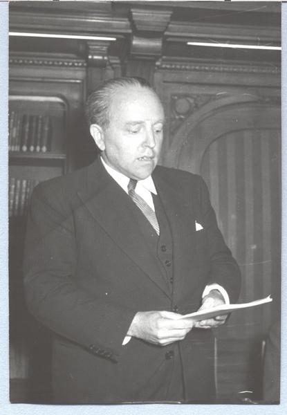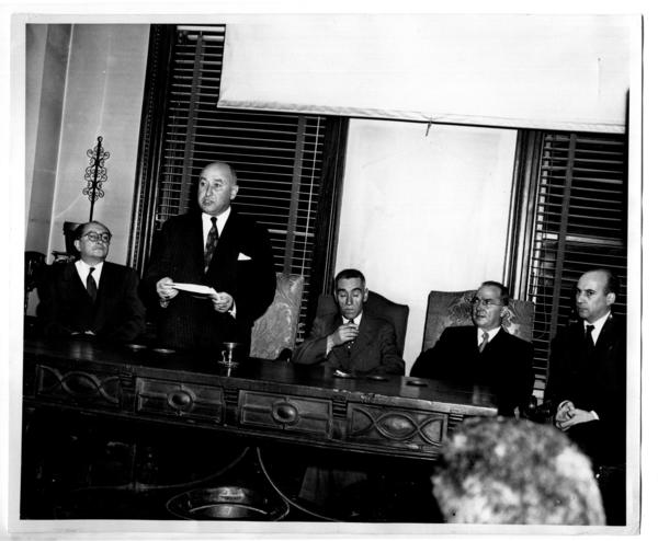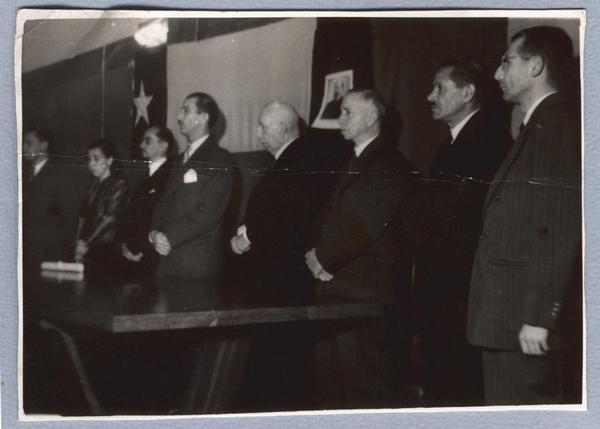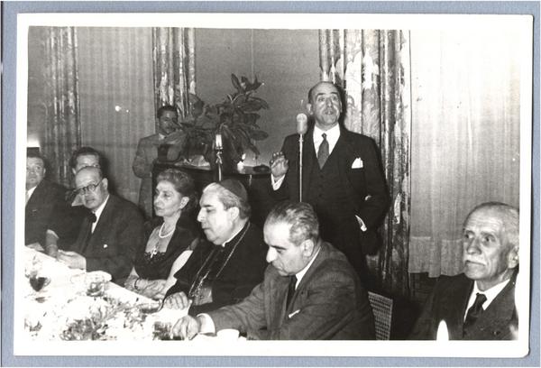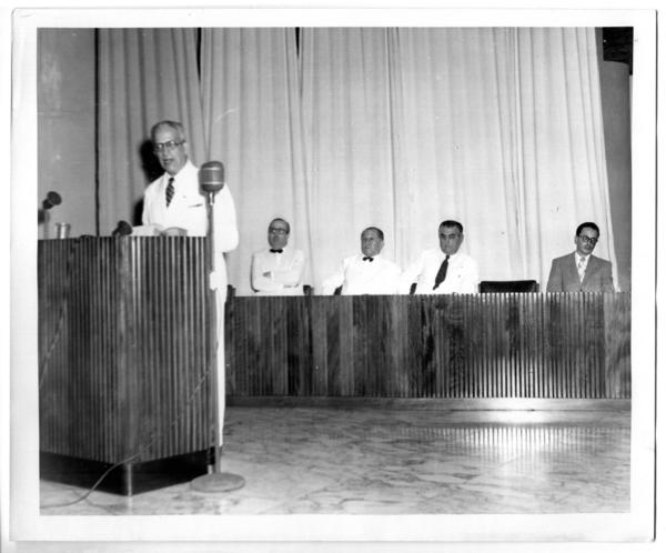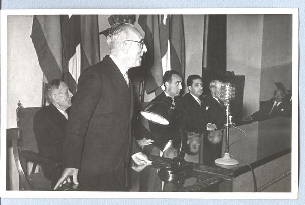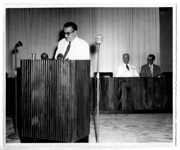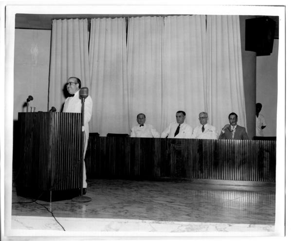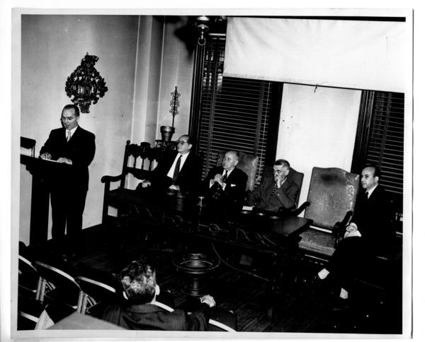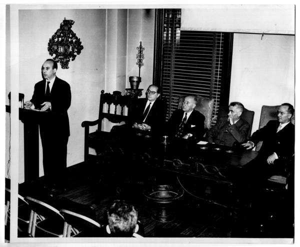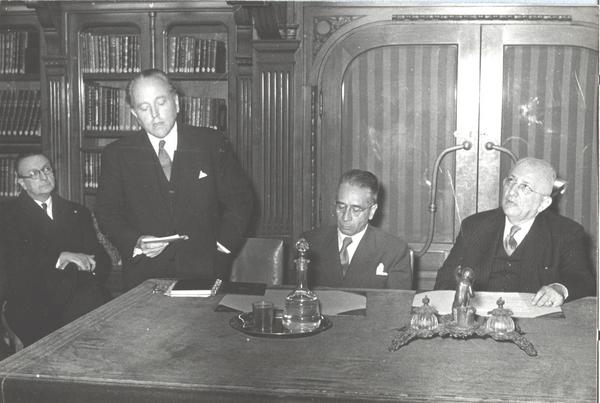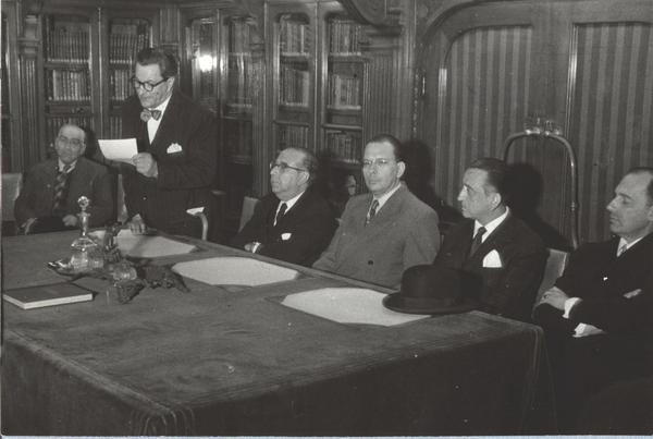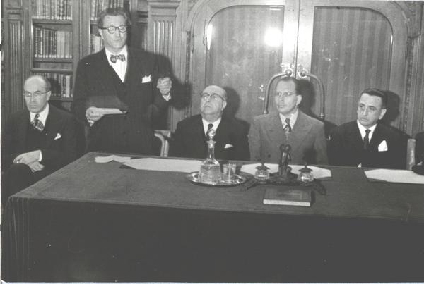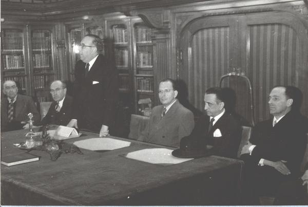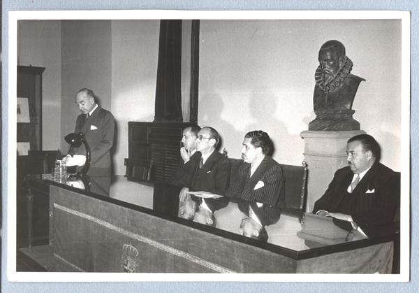 [Acto de inauguración, habla el director de la Biblioteca Nacional de Madrid Don Luis Morales Oliver.Presidente Azorin, el ministro de Educación Joaquín Ruiz Jímenez y el director de Bibliotecas y Archivos Francisco Sintes] [fotografía].
