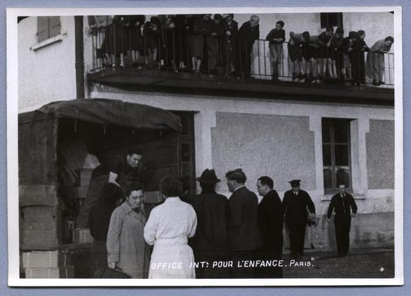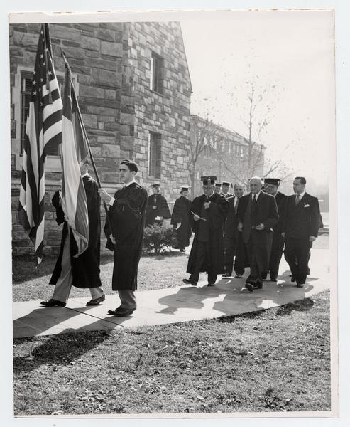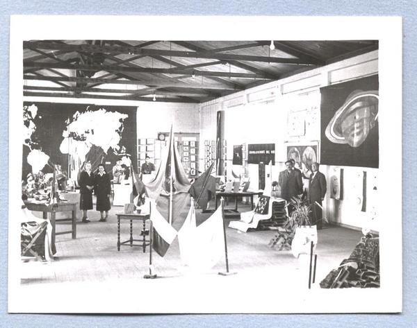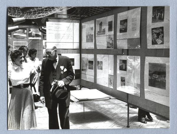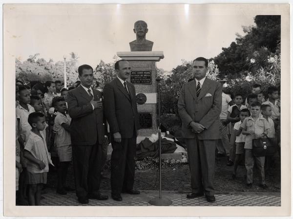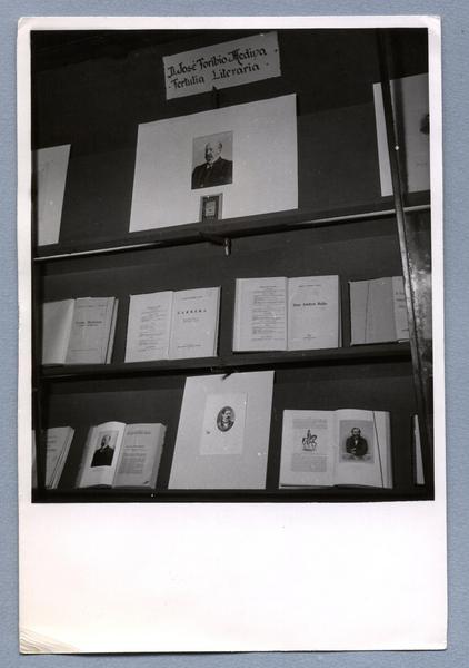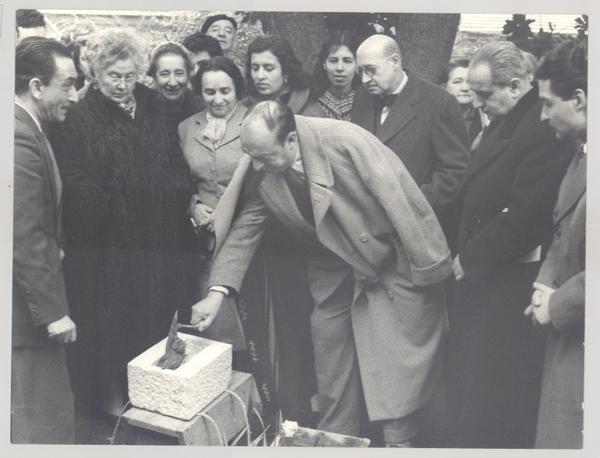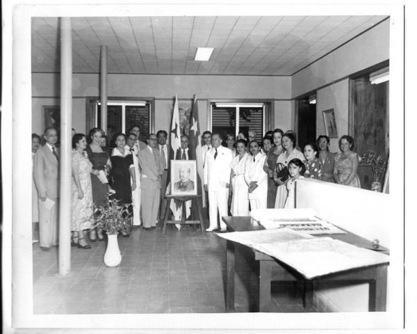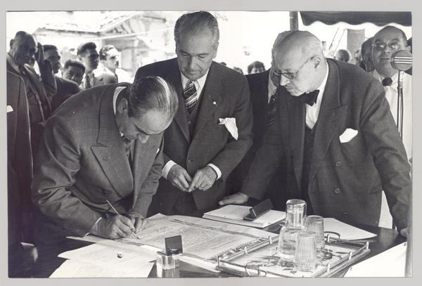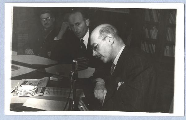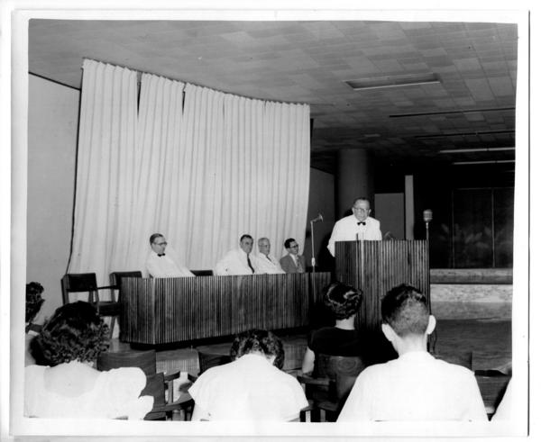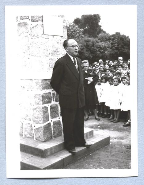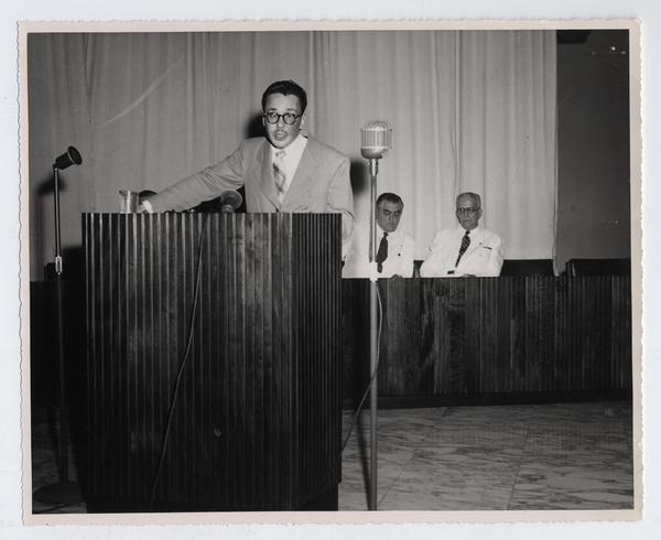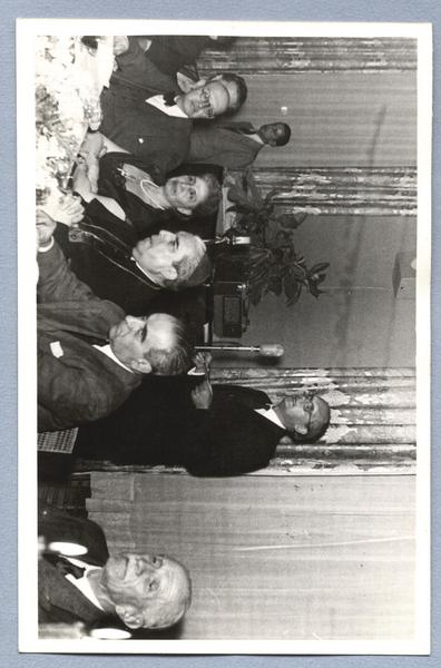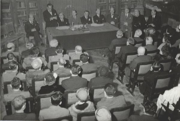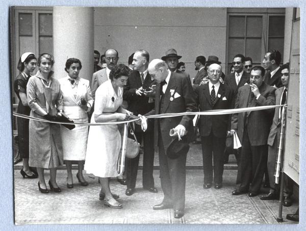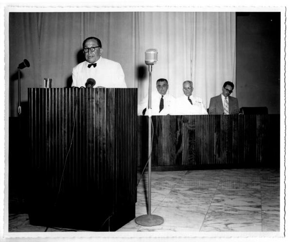 [Acto de inauguración, habla el director de la Biblioteca Nacional de Madrid Don Luis Morales Oliver.Presidente Azorin, el ministro de Educación Joaquín Ruiz Jímenez y el director de Bibliotecas y Archivos Francisco Sintes] [fotografía].