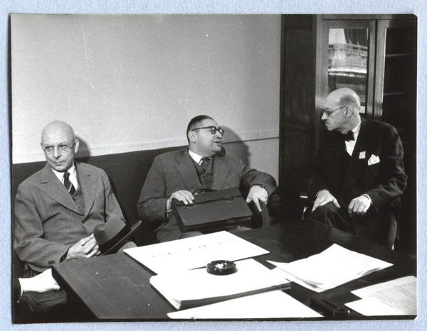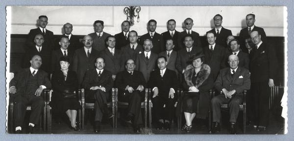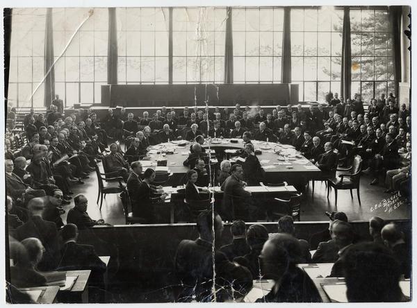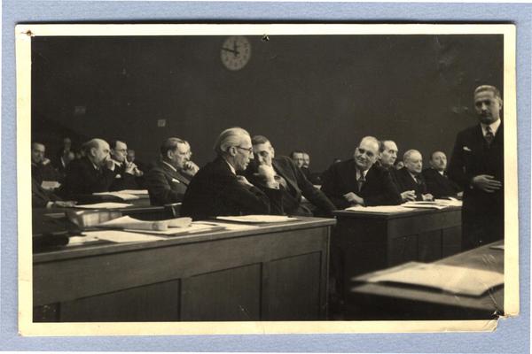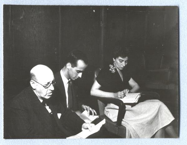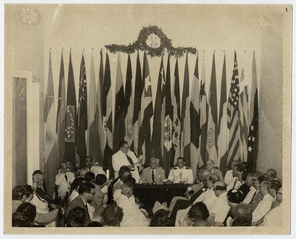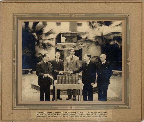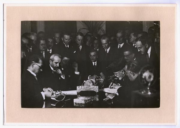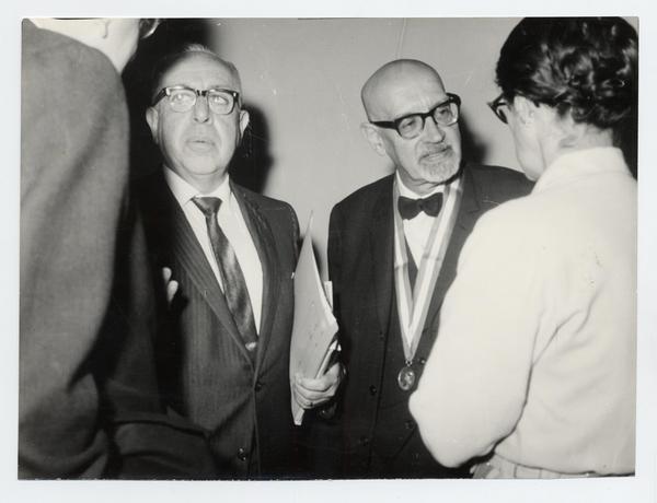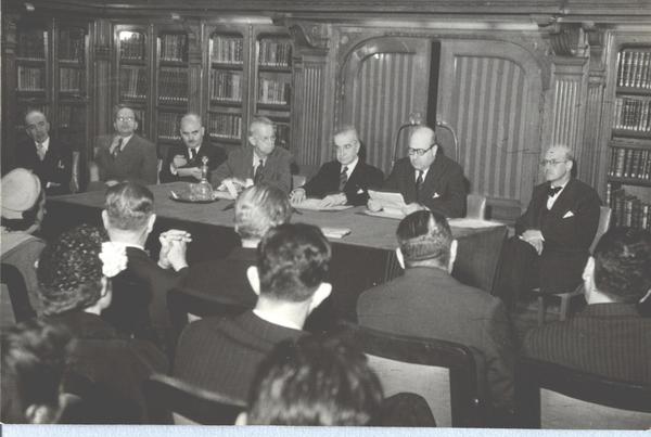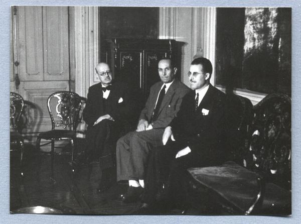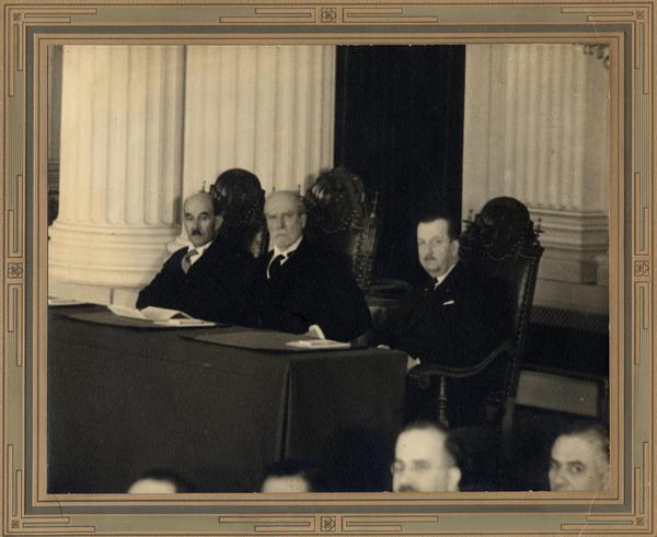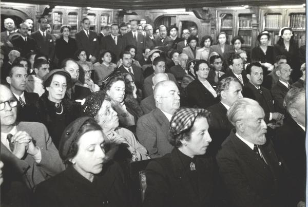 [Acto de clausura, Eugenio Orrego Vicuña pronuncia su conferencia en el salón de actos de la Biblioteca Nacional. En la foto el embajador de Chile, don Luis Subercaseaux y Don Francisco Sintes director general de archivos y bibliotecas] [fotografía].