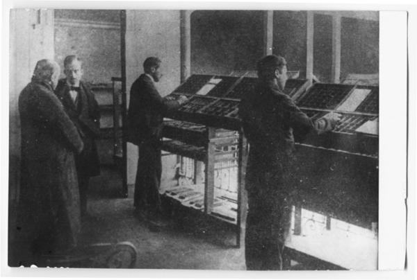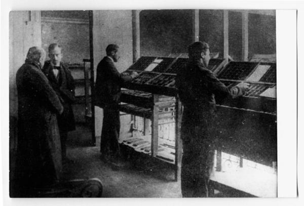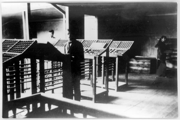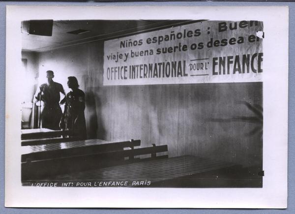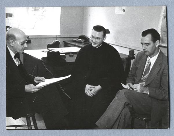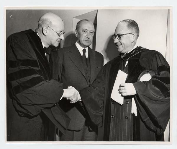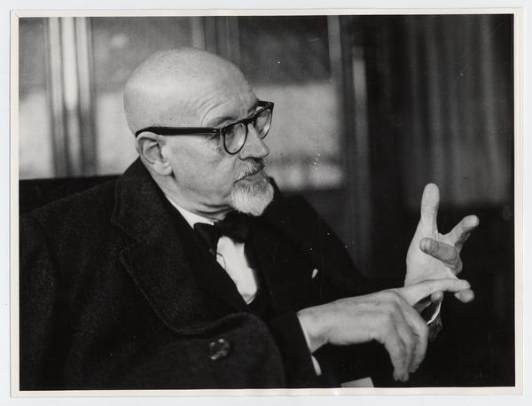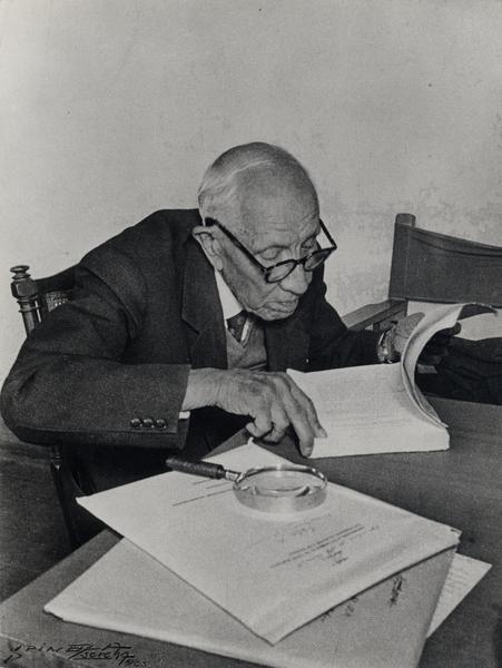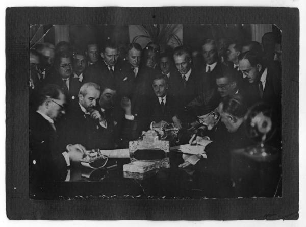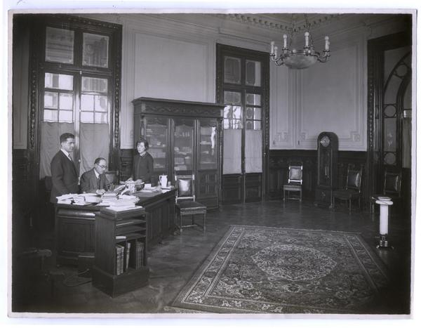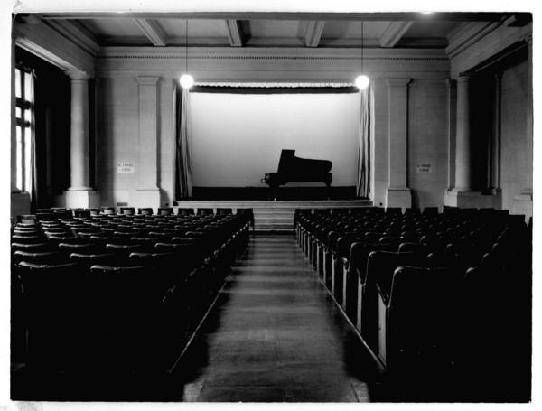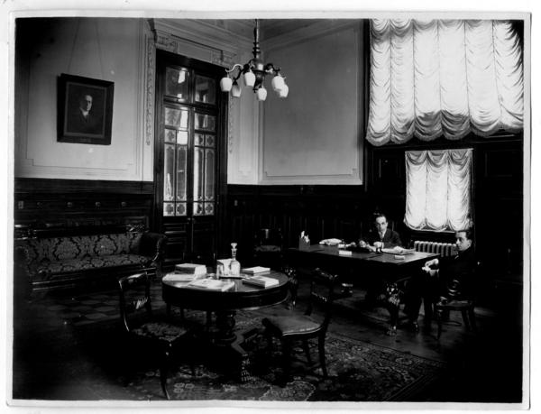 [Acto de clausura, Eugenio Orrego Vicuña pronuncia su conferencia en el salón de actos de la Biblioteca Nacional. En la foto el embajador de Chile, don Luis Subercaseaux y Don Francisco Sintes director general de archivos y bibliotecas] [fotografía].