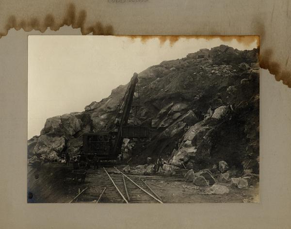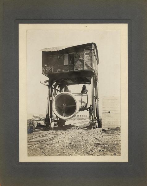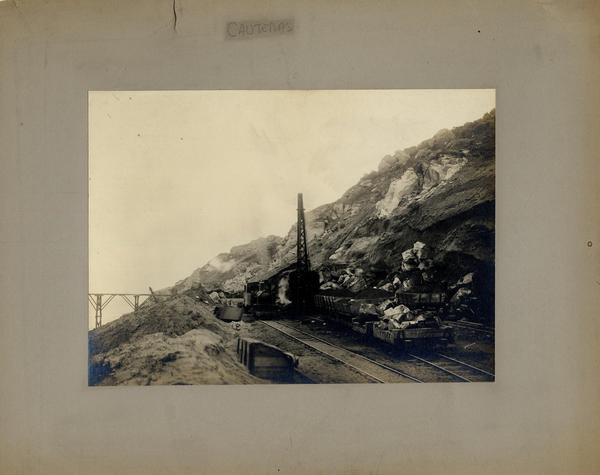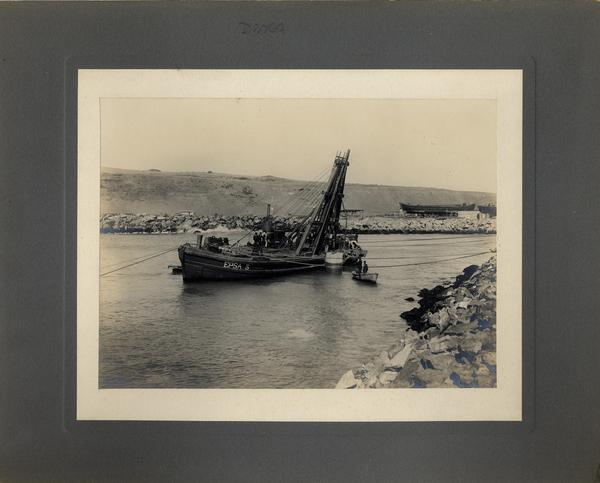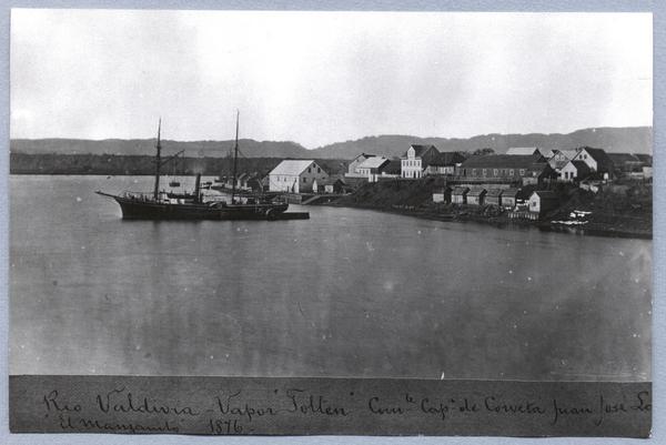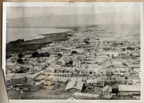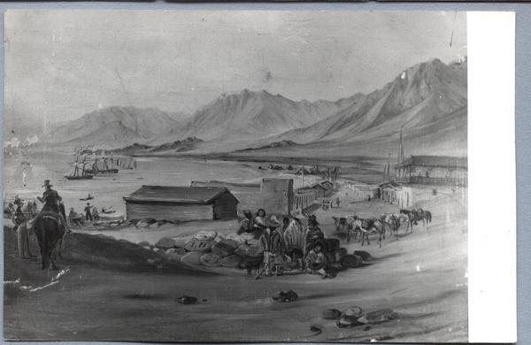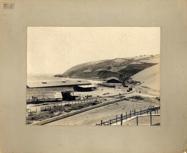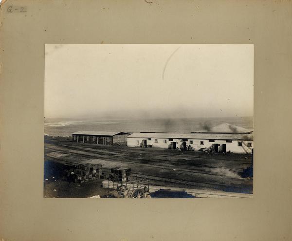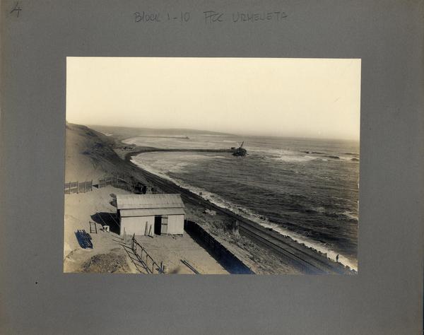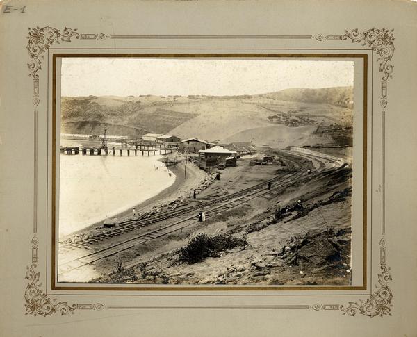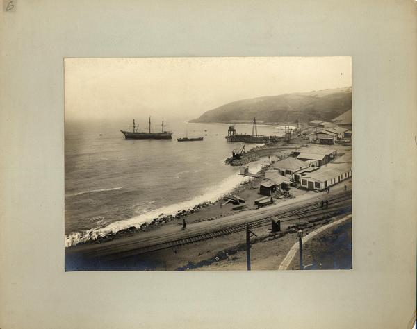 [Vista panorámica del puerto, se divisan vías férreas a orillas del mar, unas casas de la faena, y barcos en el mar] [fotografía].