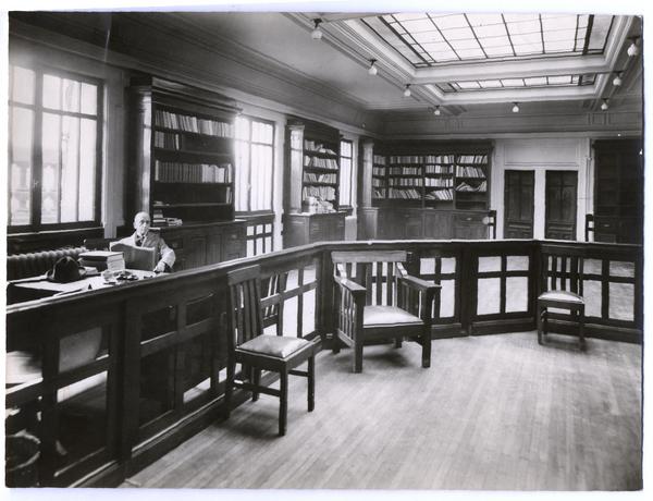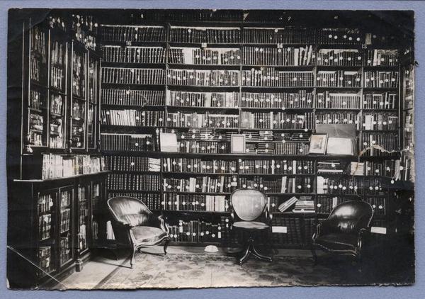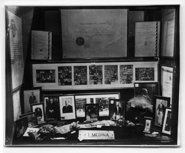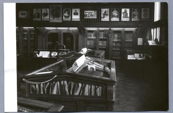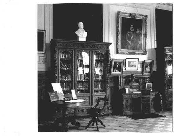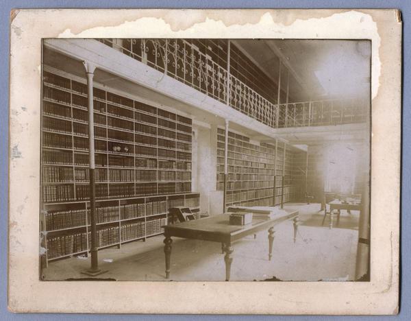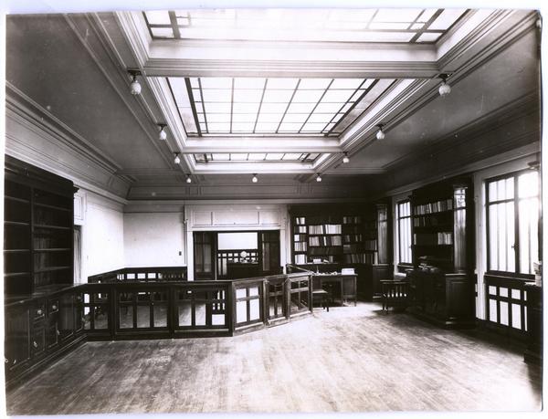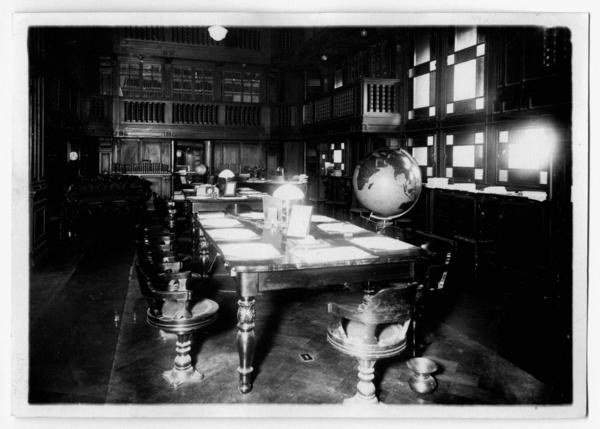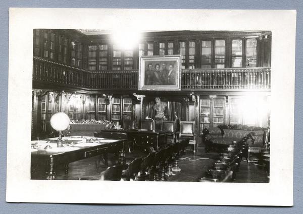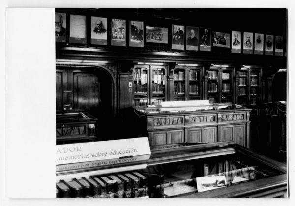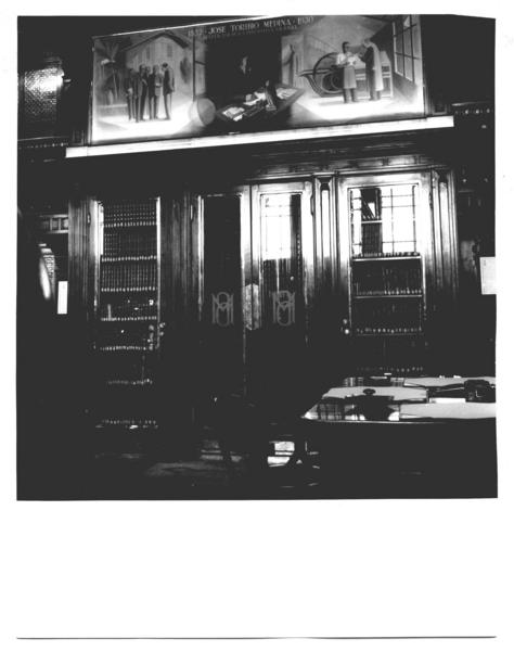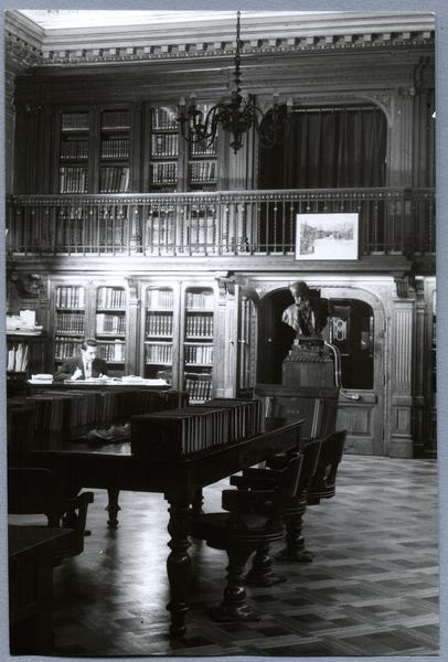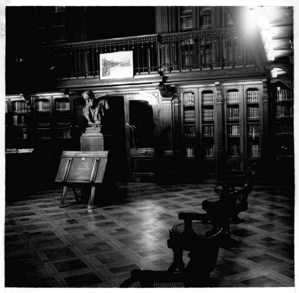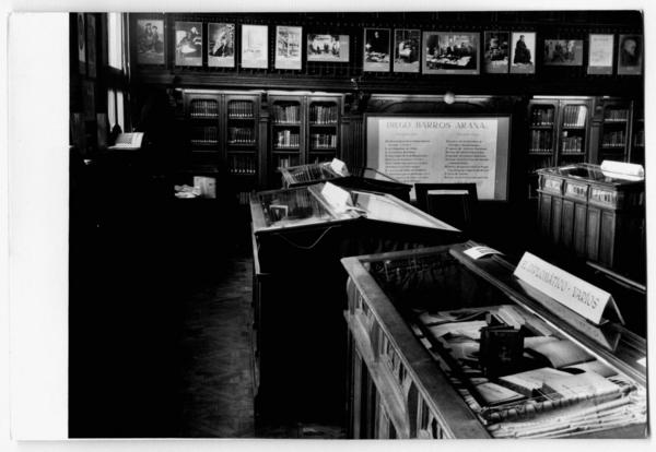 [Vista interior de la Biblioteca Americana Barros Arana, Sala Medina, Biblioteca Nacional: espacio revestido en madera de nogal, Anaqueles con puerta de vidrio, parquet de maderas nobles, lámparas de techo en bronce, de 8 brazos con bombillas como velas, balconada en el segundo piso, busto de Barros Arana] [fotografía].