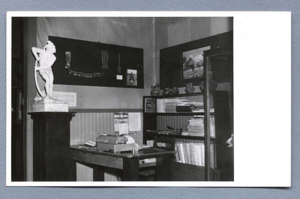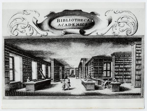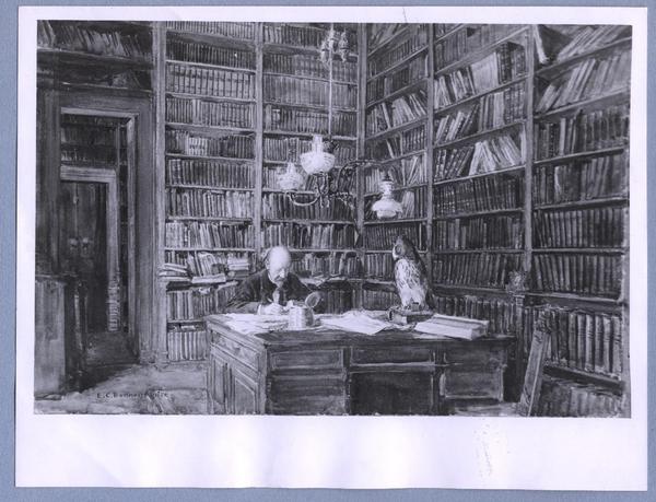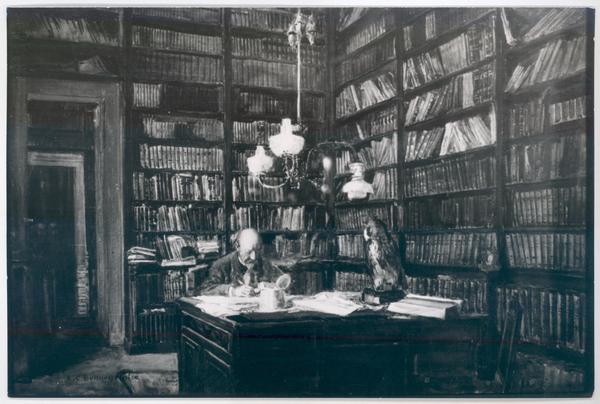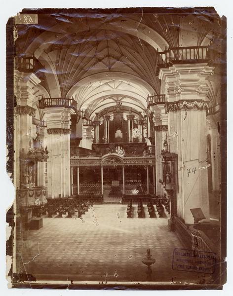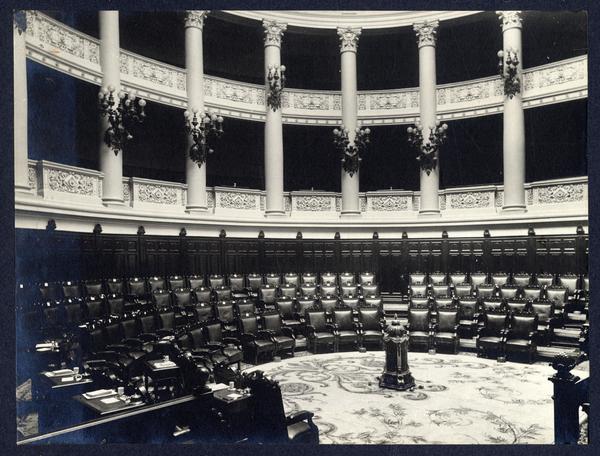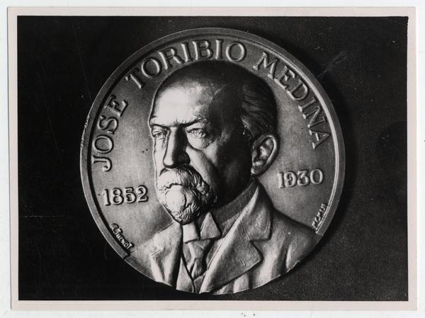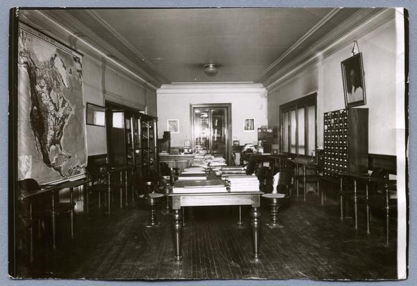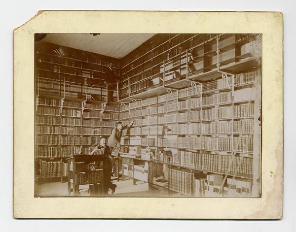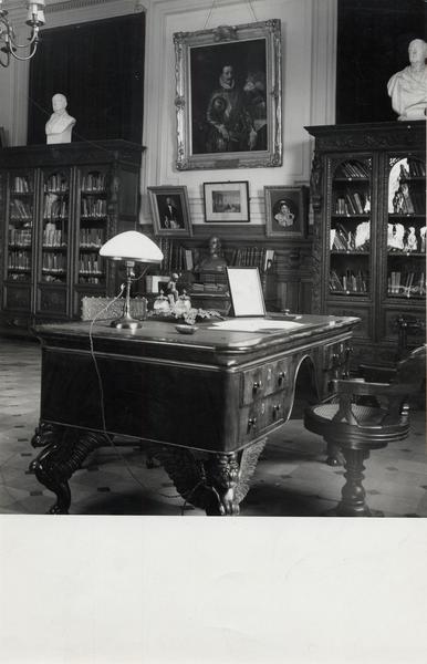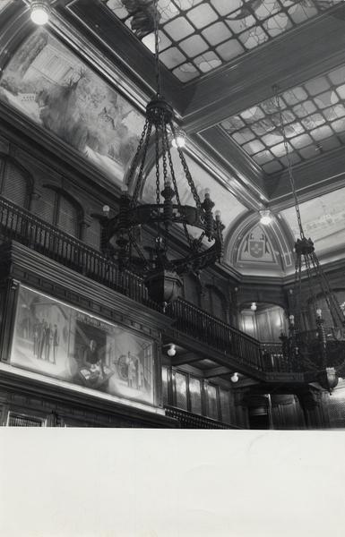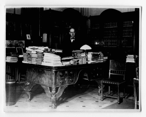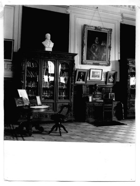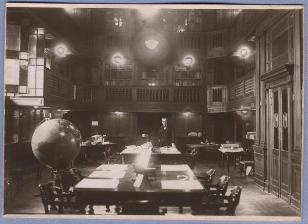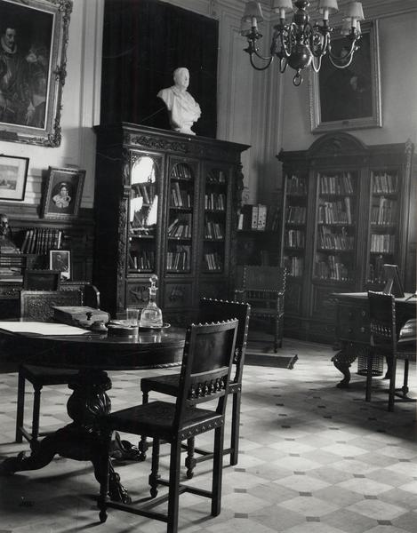 [Vista interior de la Biblioteca Americana Barros Arana, Sala Medina, Biblioteca Nacional: espacio revestido en madera de nogal, Anaqueles con puerta de vidrio, parquet de maderas nobles, lámparas de techo en bronce, de 8 brazos con bombillas como velas, balconada en el segundo piso, busto de Barros Arana] [fotografía].