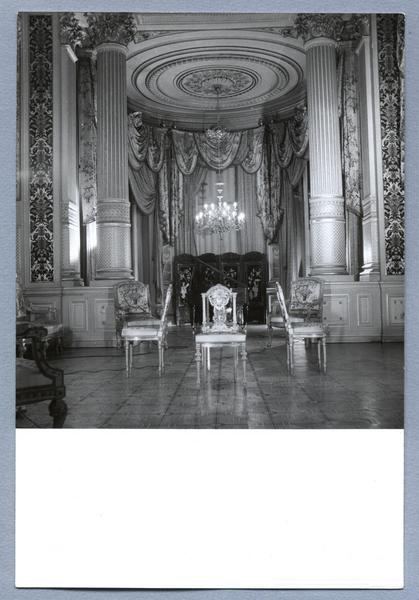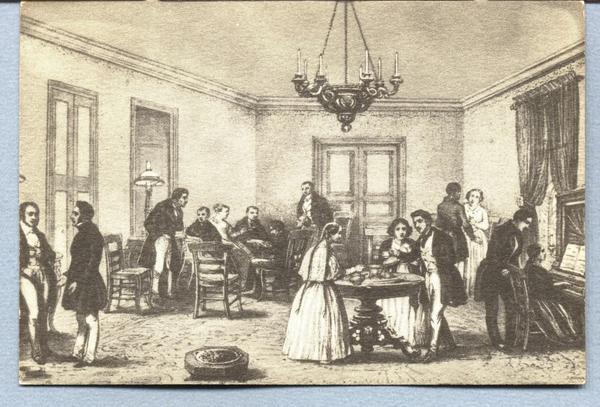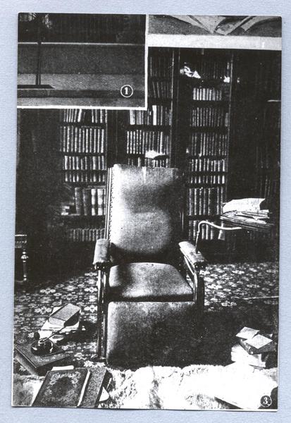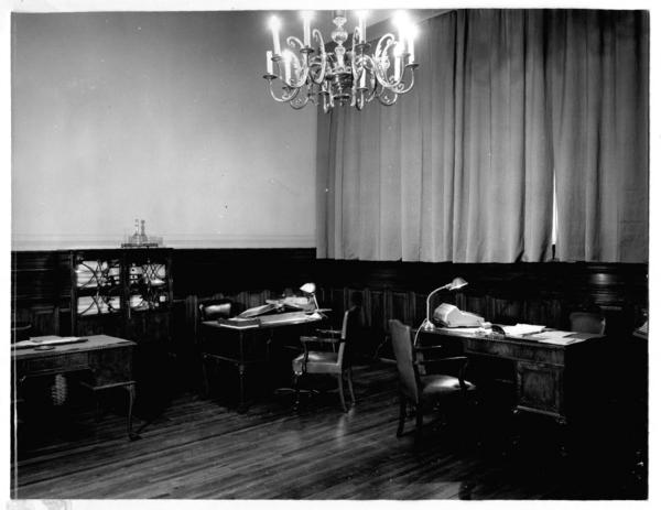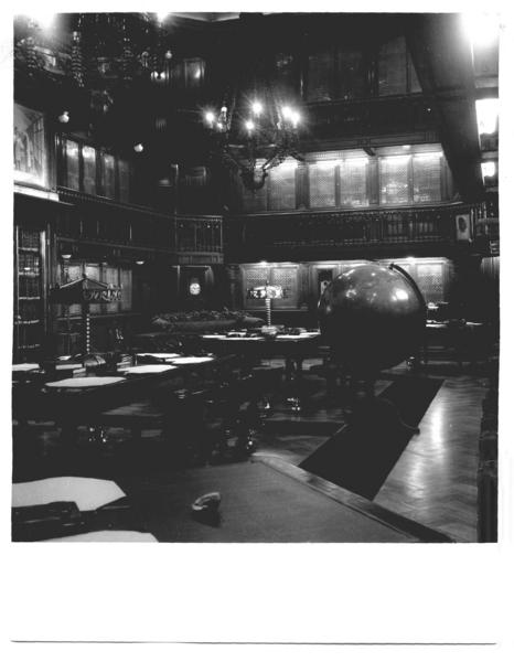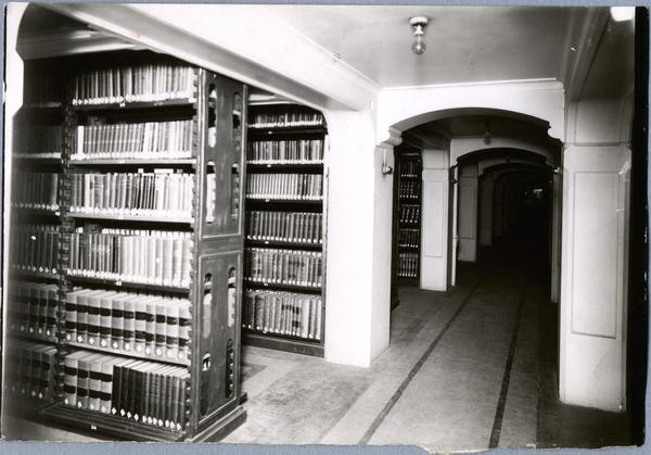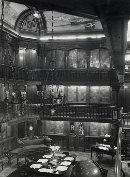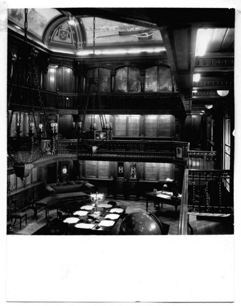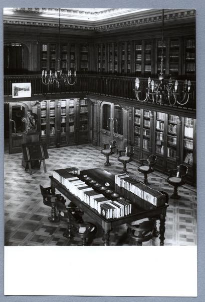 [Vista interior del fondo Bibliográfico Sala Medina, Biblioteca Nacional: Espacio revestido en madera de nogal, Anaqueles con puerta de vidrio, parquet de madera noble, lámparas de techo en bronce, de 8 brazos con bombillas como velas, balconada en el segundo piso, mobiliario de maderas nobles] [fotografía].