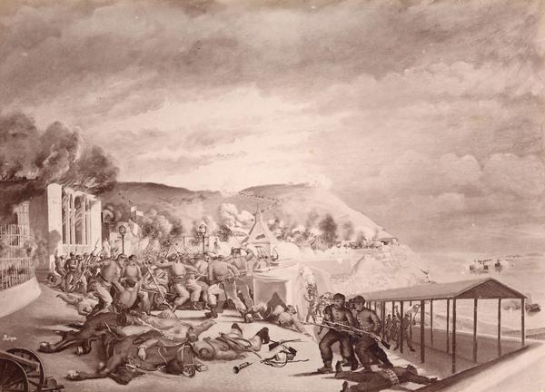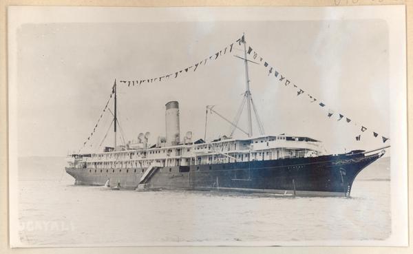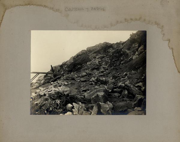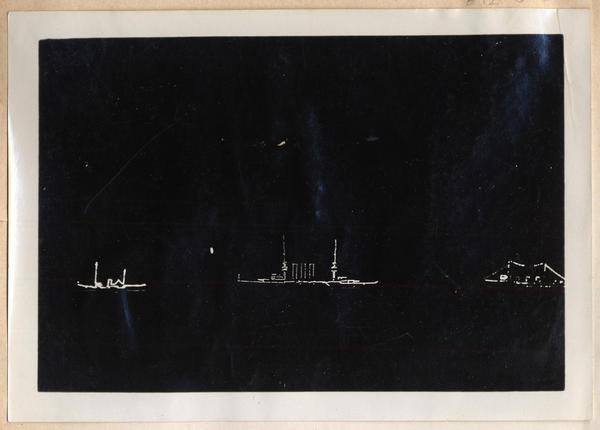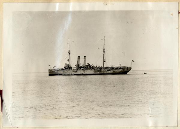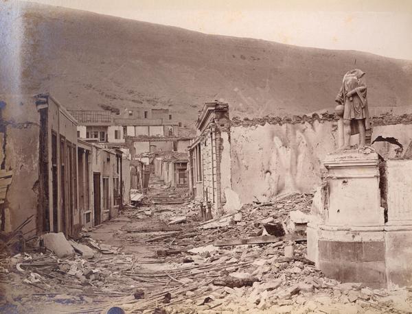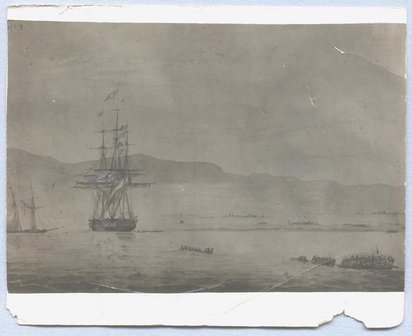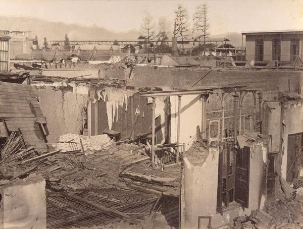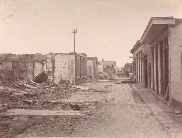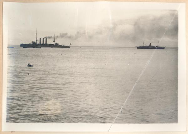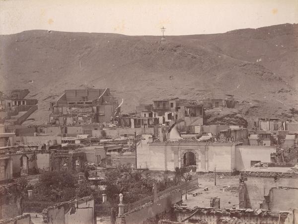 [Vista panorámica de la bahía de Valparaíso después del terremoto en 1906, se observan edificios destruídos, y barcos en el mar] [fotografía].