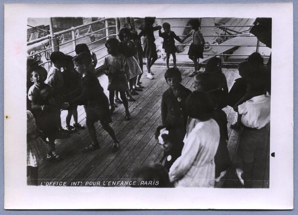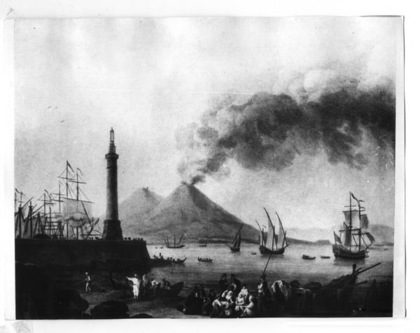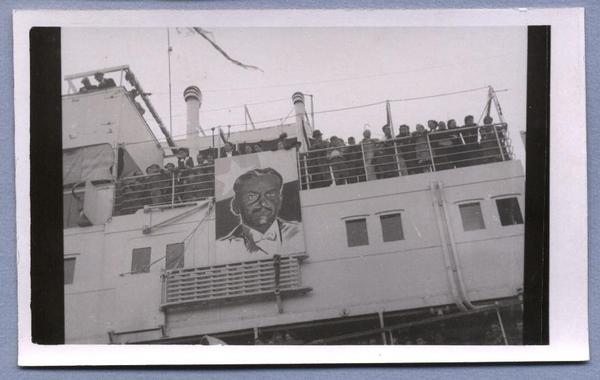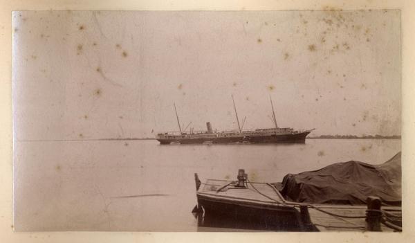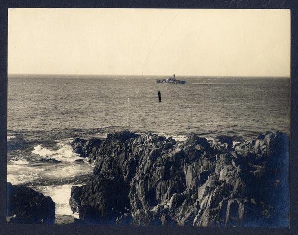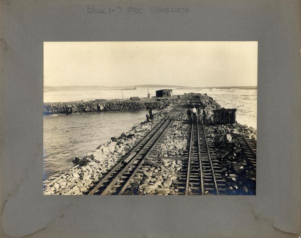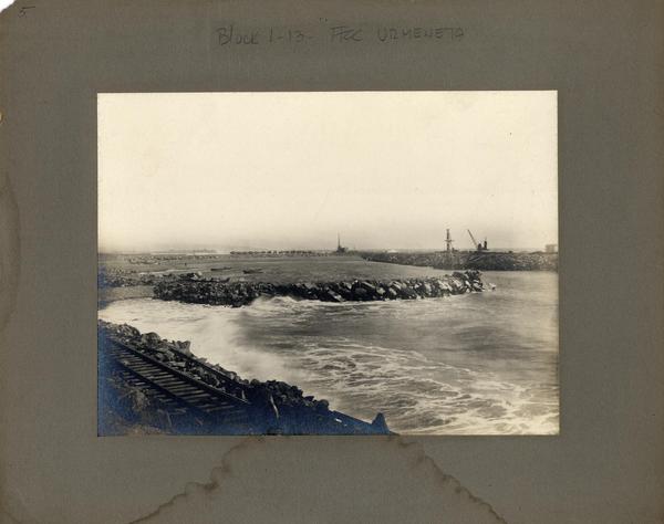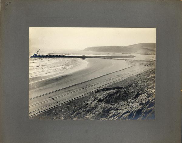 [Vista general del terminal marítimo, del muelle, se divisan vías férreas a orillas del mar y un barco en altamar] [fotografía].