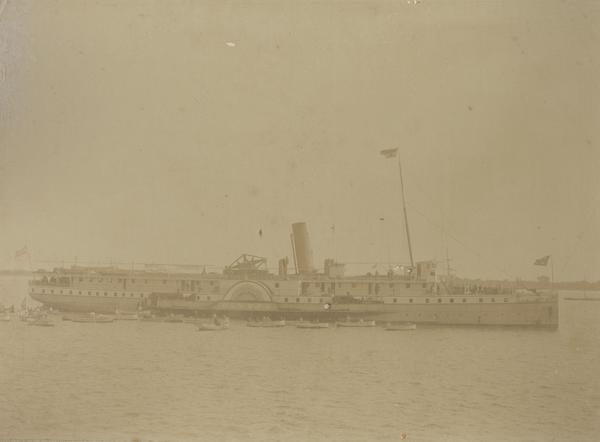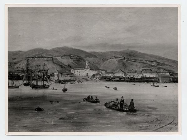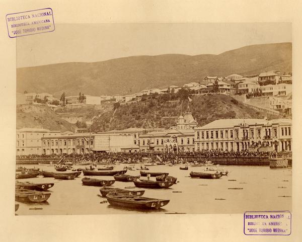 [Vista general de Valparaíso desde el muelle fiscal, en el mar se divisan botes y en el fondo lo cerros] [fotografía] Fotografía Leblanc.