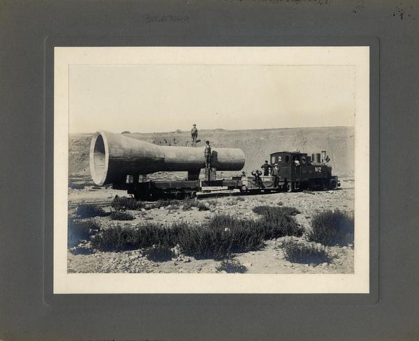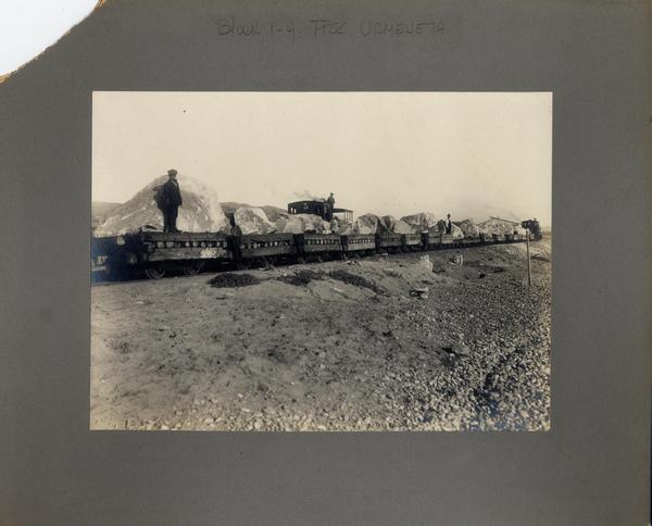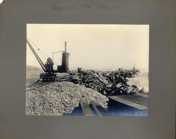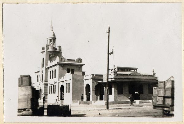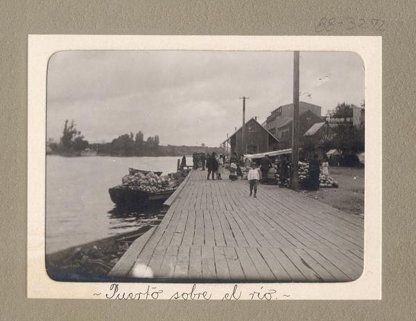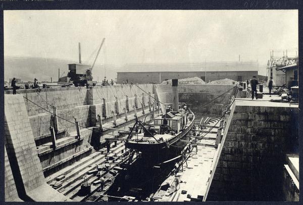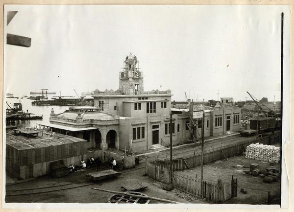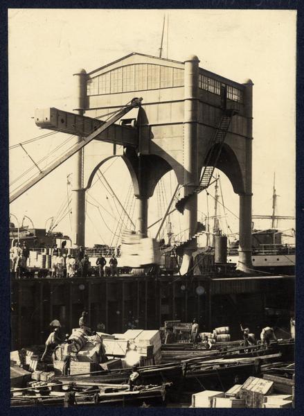 [Vista panorámica del puerto, se divisa el muelle, terminal ferroviario con una locomotora, vías férreas y almacenes] [fotografía].