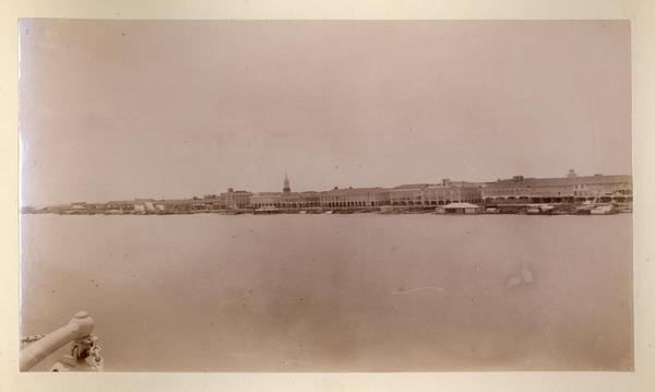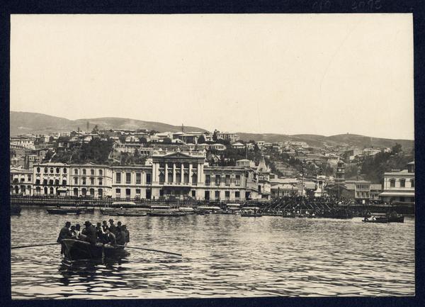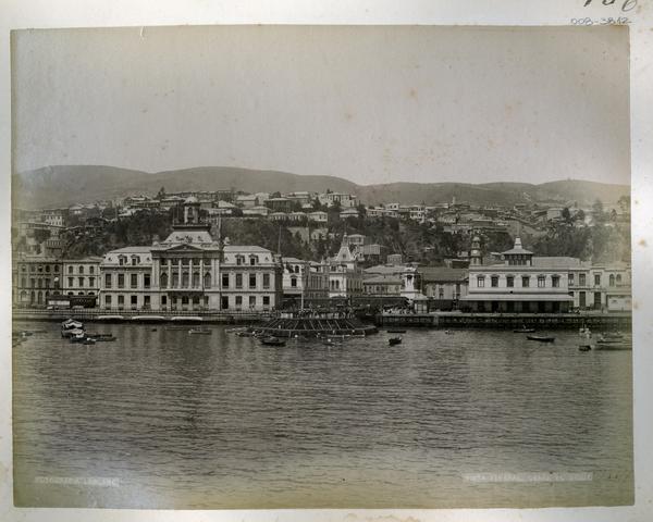 [Vista general de Valparaíso desde el dique, visualizando las edificaciones, el mar, y de fondo los cerros] [fotografía] Fotografía Leblanc.