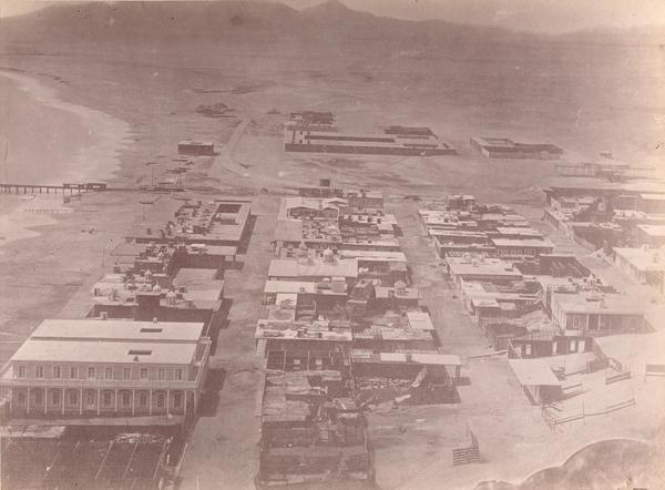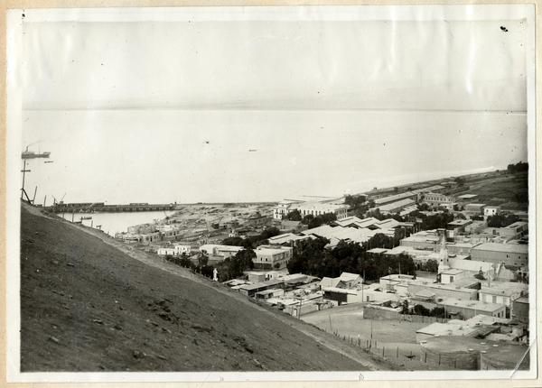 [Vista panorámica del puerto, desde el cerro, se divisa el muelle, almacenes, vías férreas y unos barcos en el mar] [fotografía].
