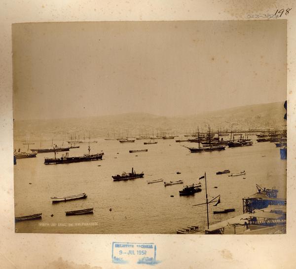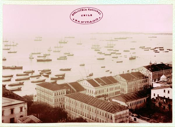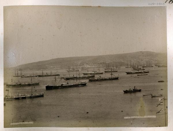 [Vista general del Puerto de Valparaíso, con barcos en el mar] [fotografía] Fotografía Leblanc.
