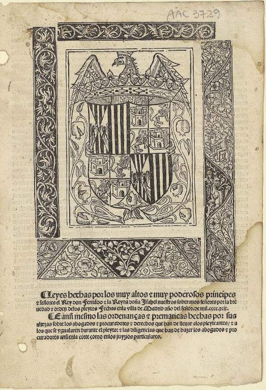 Leyes hechas por los muy altos [y] muy poderosos principes y señores el rey don Fernando y la reyna doña Ysabel n[uest]ros soberanos señores por la breuedad [y] orden delos pleytos, hechas enla villa de Madrid, año del señor de mill [y] quatrocientos [y] nouenta [y] nueve...