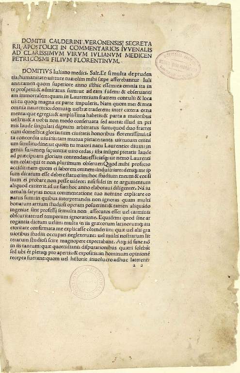 Domitii Calderini Veronensis secretarii apostolici in commentarios luuenalis ad clarissimum virum Iulianum medicen Petri Cosmi filium Florentinum Domiti Calderini.