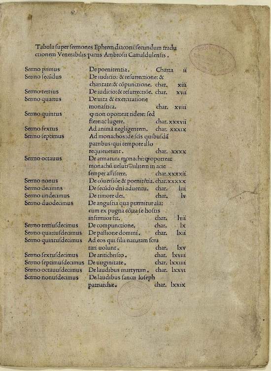 Tabula super sermones Ephren diaconi San Ephrem ; secundum traductionem venerabilis patris Ambrosii Camaldulensis.