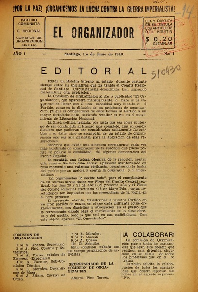 El Organizador Partido Comunista. C. Regional. Comisión Organizadora.