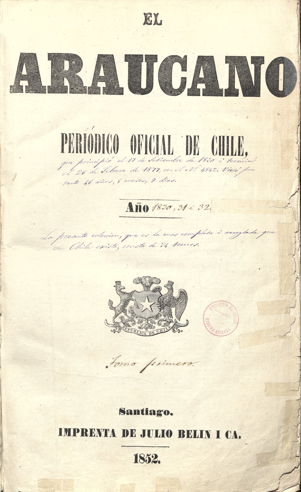 El Araucano. Santiago de Chile : Impr. de la Opinion, 1830-1877. 48 v. ; 20-45 cm. .