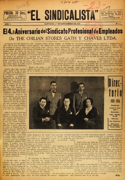 Inicio / Fondos y Colecciones / Periódicos / Autores Secundarios / Sindicato Profesional de Empleados de The Chilean Stores Gath y Chaves (Chile)