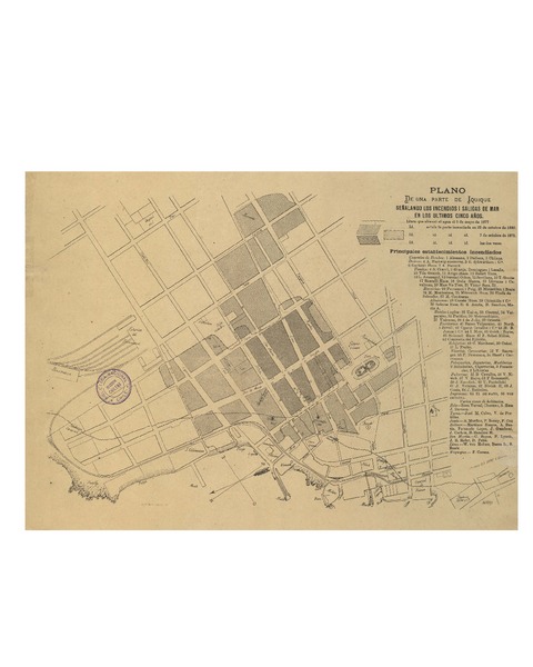 Plano de una parte de Iquique señalando los incendios y salidas de mar en los últimos cinco años [material cartográfico].