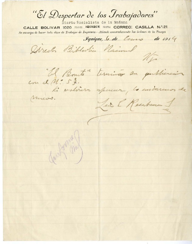 [Carta] 1914 enero 6, Iquique, Chile [a] Biblioteca Nacional de Chile [manuscrito] Luis Emilio Recabarren.
