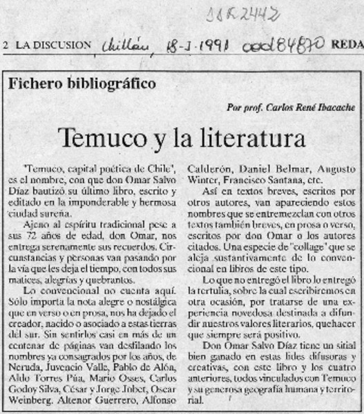 Temuco y la literatura [artículo] Carlos René Ibacache.