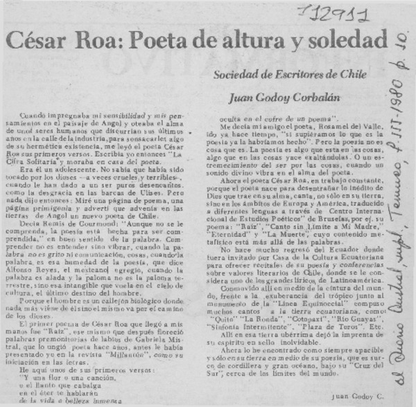 César Roa, poeta de altura y soledad [artículo] Juan Godoy Corbalán