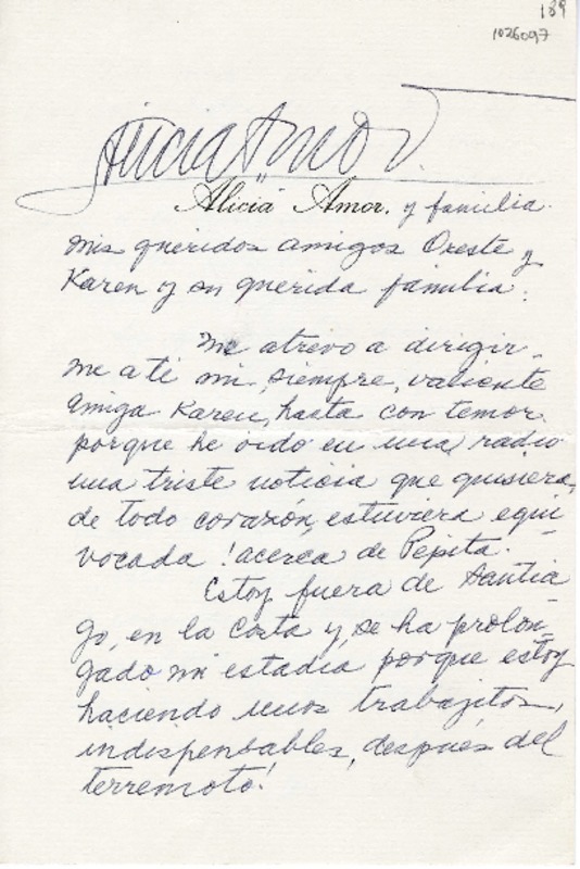 [Carta] 1986, verano, Algarrobo, Santiago [a] Oreste Plath [manuscrito] Alicia Amor.