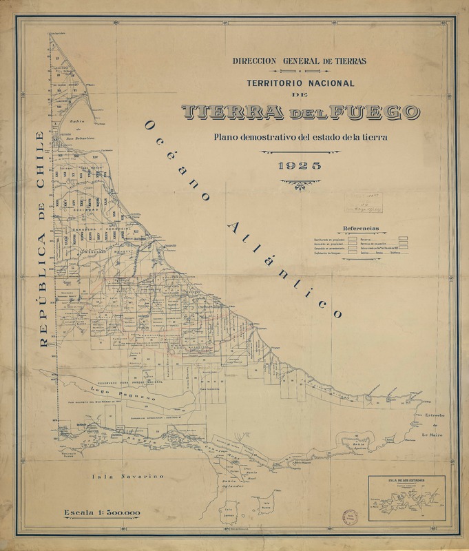 Territorio nacional de Tierra del Fuego plano demostrativo del estado de la tierra [material cartográfico] : Dirección general de Tierras.
