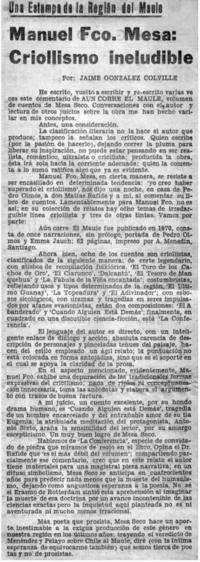 Manuel Fco. Mesa: Criollismo ineludible [artículo] / Jaime González Colville. El Heraldo (Linares, Chile)-- jun. 7, 1973, p. 2. .