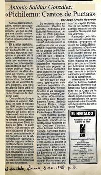 "Pichilemu : cantos de Puetas" [artículo] / José Arraño Acevedo. El Heraldo (Diario : Linares, Chile)-- dic. 5, 1998, p. 2. .