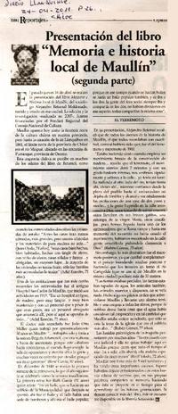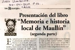 Presentación del libro "Memoria e historia local de Maullín" (segunda parte) [artículo] / Pablo Fábrega. El Llanquihue (Diario : Chiloé, Chile)-- abr. 24, 2011, p. 26. .