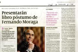 Presentarán libro póstumo de Fernando Moraga el texto "Gente de la Serena" presenta más de 300 biografías de grandes personalidades de la capital regional y de las familias fundadoras de la zona / [artículo] : Carolina Rojas Rozas. Tiempo Libre (Diario : La Serena, Chile) -- dic. 27, 2013, p. 128 retrato. .