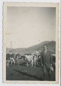 Hombre en criadero de animales de la Hacienda San Vicente [Fotografía] Chile : [Editor no identificado] , 1942. 1 Fotografía : Formato digital. .