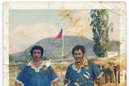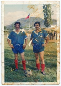 [Miguel Santibañez junto a otro jugador de fútbol del Club Deportivo Rosa Squella] : [Fotografía]. Chile : [Editor no identificado] , 1974. 1 Fotografía : Formato digital. .