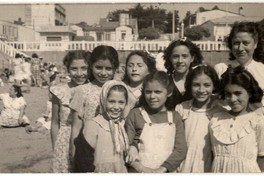 Fotografía de grupo de niñas en un balneario, junto a mujer adulta [profesora]. De fondo, mirador y construcciones de esa localidad.