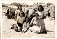 Grupo familiar, compuesto por mujeres, hombres y una niña, aparecen en la fotografía en balneario no identificado, que podría ser Cartagena. Al fondo, las casa cercanas a la playa y la tradicional terrraza de ese balneario.