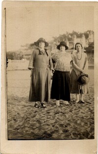 Tres mujeres con sombreroen la Playa Chica de Cartagena. Al fondo la Iglesia "maldita" del balneario.