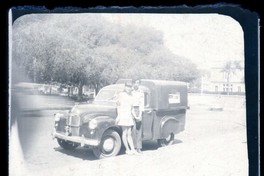[Mujer y hombre delante apoyados en un automóvil en un costado de la plaza Vergara] [fotografía]. [Viña del Mar, Chile] : [entre 1940 y 1950]. 1 fotografía : negativo sobre papel ; 9 x 7 cm. .