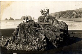Grupo de personas aparecen en la fotografía sobre dos montículos rocosos de balneario de Constitución, y de espalda al mar. En una de las rocas se lee "Botica" y más abajo "estrella".